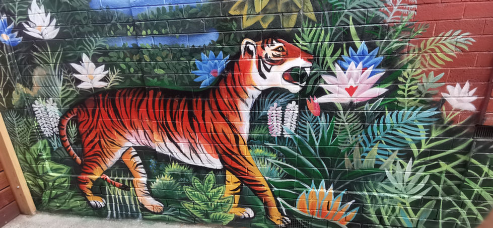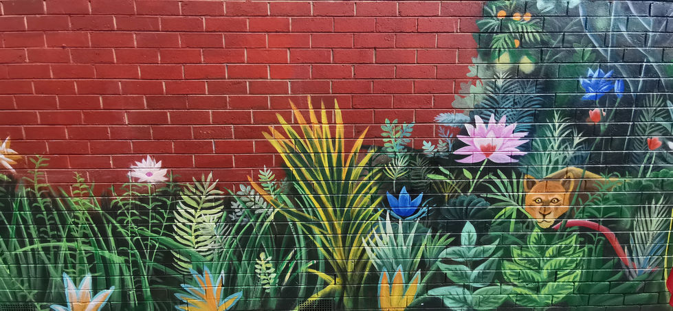 A tiger prowls through dense foliage as exotic flowers and hidden creatures emerge from the greenery, creating a lively and immersive setting that sparks curiosity and conversation. The mural’s rich palette and storytelling composition enhance the warm, communal atmosphere of the space, turning an ordinary brick wall into a vivid centerpiece.